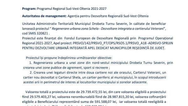 Proiectele pentru localitățile județului Mehedinţi presupun investiții în infrastructura rutieră și de utilități, unități de învățământ, de cultură.