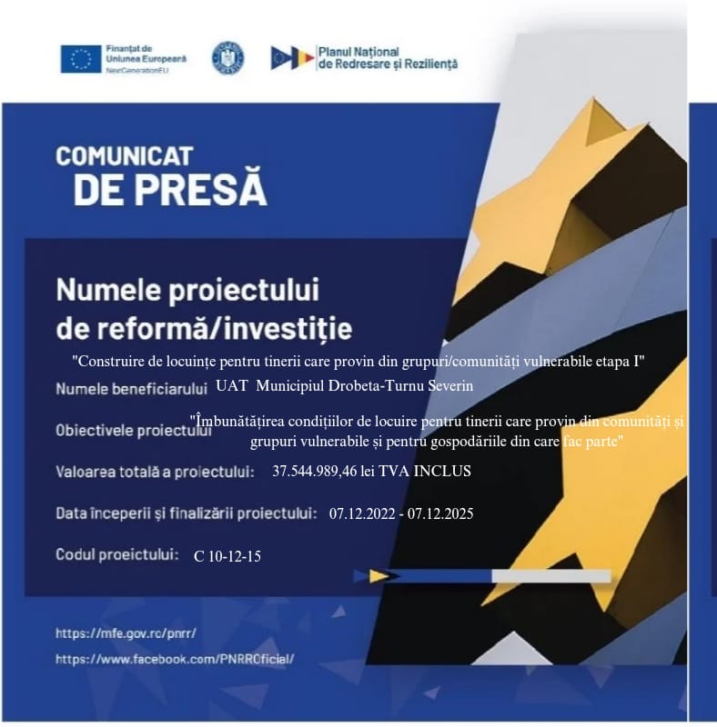 Primăria Drobeta -Turnu Severin, construiește locuințe pentru tineri care provin din grupuri/comunități vulnerabile cu fonduri din Programul Național de Redresare și Reziliență, în valoare de totală de 37.544.989,46 lei cu TVA.