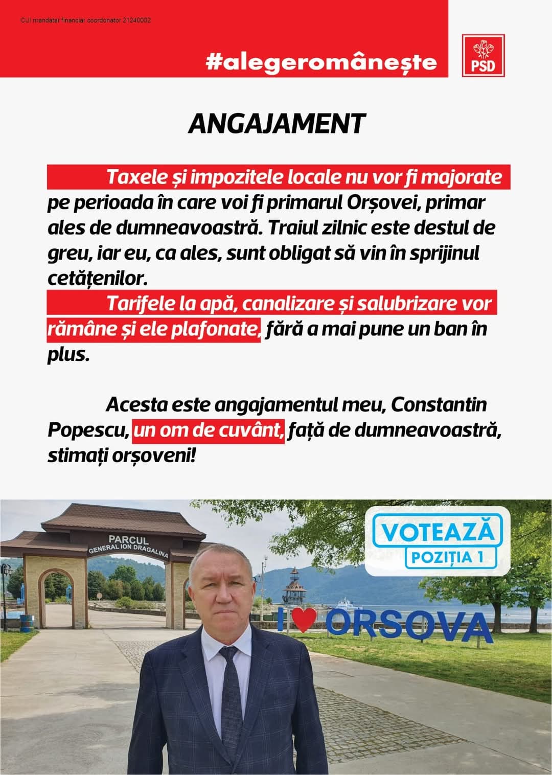 Angajamentul pe care Constantin Popescu și l-a asumat în perioada campaniei, în alegerile locale, a fost respectat. Promisiunile făcute de către actualul viceprimar, vor fi îndeplinite, atâta timp cât va exista o majoritate a Consiliului Local Orșova, care va decide să reprezinte orșovenii și interesele acestora.