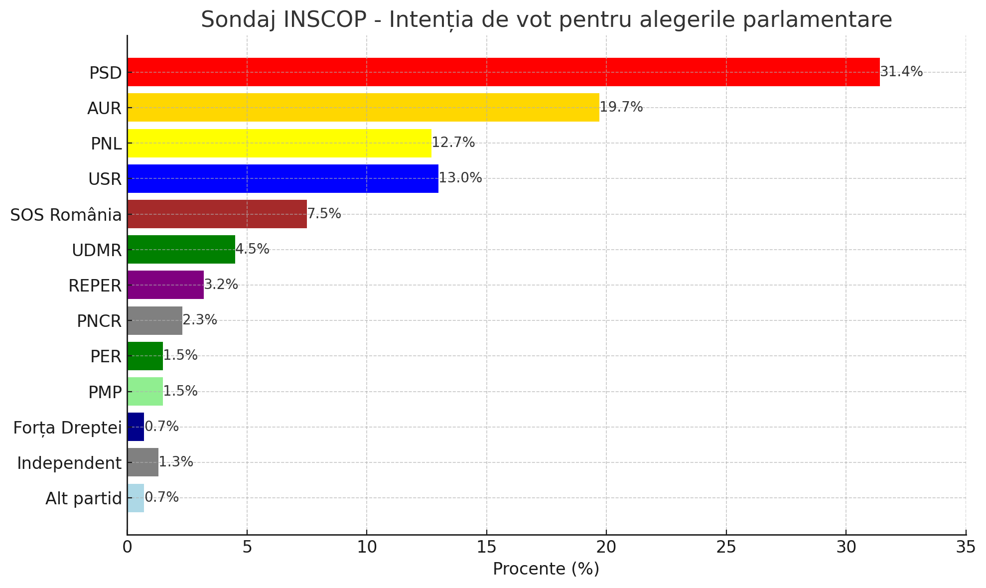 „Intenția de vot a românilor pentru alegerile parlamentare ar putea produce un veritabil cutremur politic în condițiile în care partidele cu profil extremist-suveranist (AUR, SOS România, PNCR) obțin un scor cumulat de peste 30%, triplu comparativ cu rezultatele alegerilor de acum patru ani (notă: pragul de 5% va reprezenta însă o provocare pentru unele dintre aceste partide)”, a afirmat directorul INSCOP Research, Remus Ștefureac.