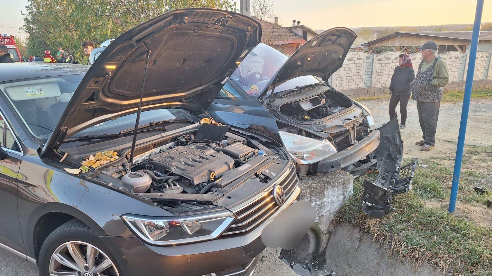 Două autoturisme s-au ciocnit, iar în urma impactului, ambele au fost aruncate într-un cap de pod.