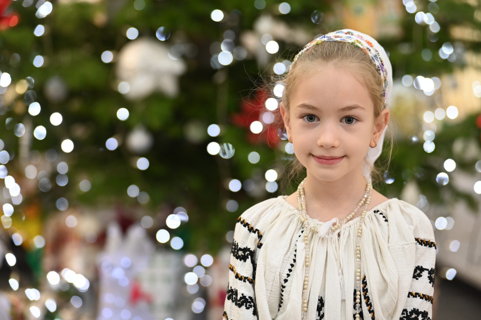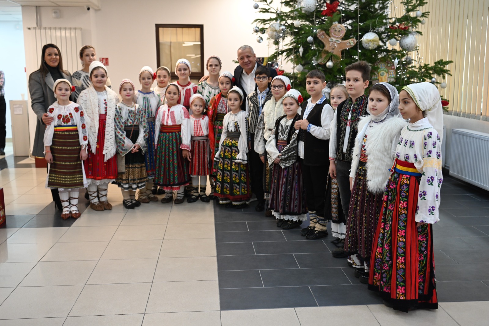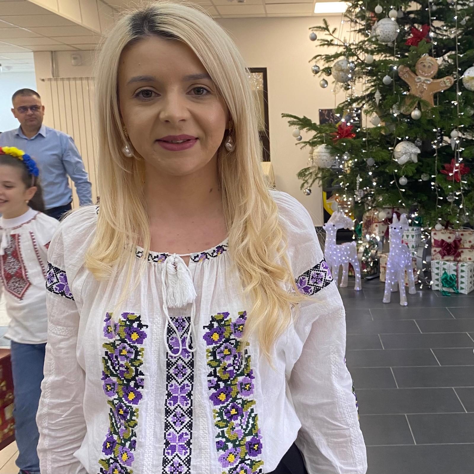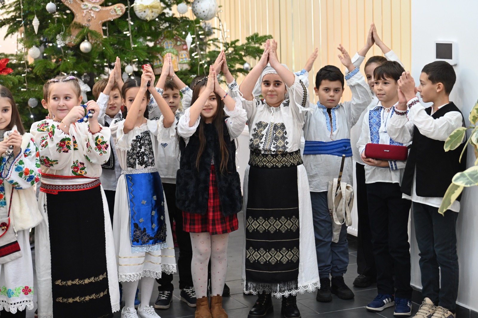 „Am venit cu doamna profesoară și îi avem alături și pe părinții noștri, suntem foarte bucuroși. Avem costume naționale, ne place foarte mult aici, bradul este foarte frumos împodobit,” spune Sara, una dintre elevele de la Palatul Copiilor din Drobeta-Turnu Severin.