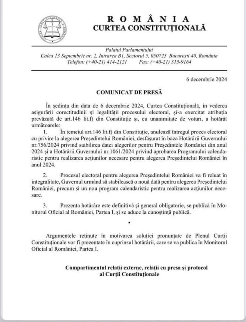 ”În temeiul articolului 146 litera f din Constituție, anulează întregul proces electoral cu privire la alegerea președintelui României”, se arată în comunicat. Art 146, litera f) prevede că CCR ”veghează la respectarea procedurii pentru alegerea Preşedintelui României şi confirmă rezultatele sufragiului”.