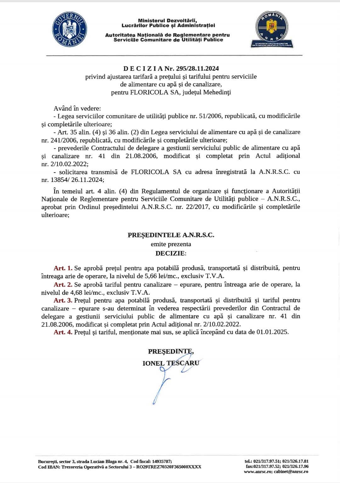 Art.1. Se aprobă preţul pentru apa potabilă produsă, transportată și distribuită, pentru întreaga arie de operare, la nivelul de 5,66 lei/mc., exclusiv T.V.A.