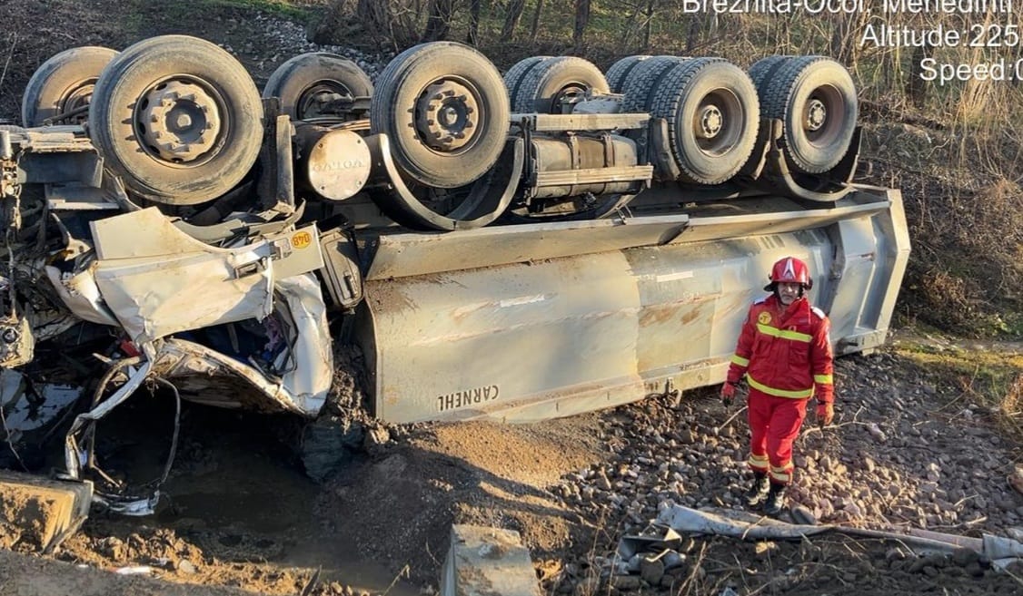 Un accident rutier grav s-a produs în această dimineață în localitatea Jidoștița, județul Mehedinți. O basculantă încărcată cu balast s-a răsturnat în albia râului Jidoștița după ce vehiculul a rămas fără frâne.