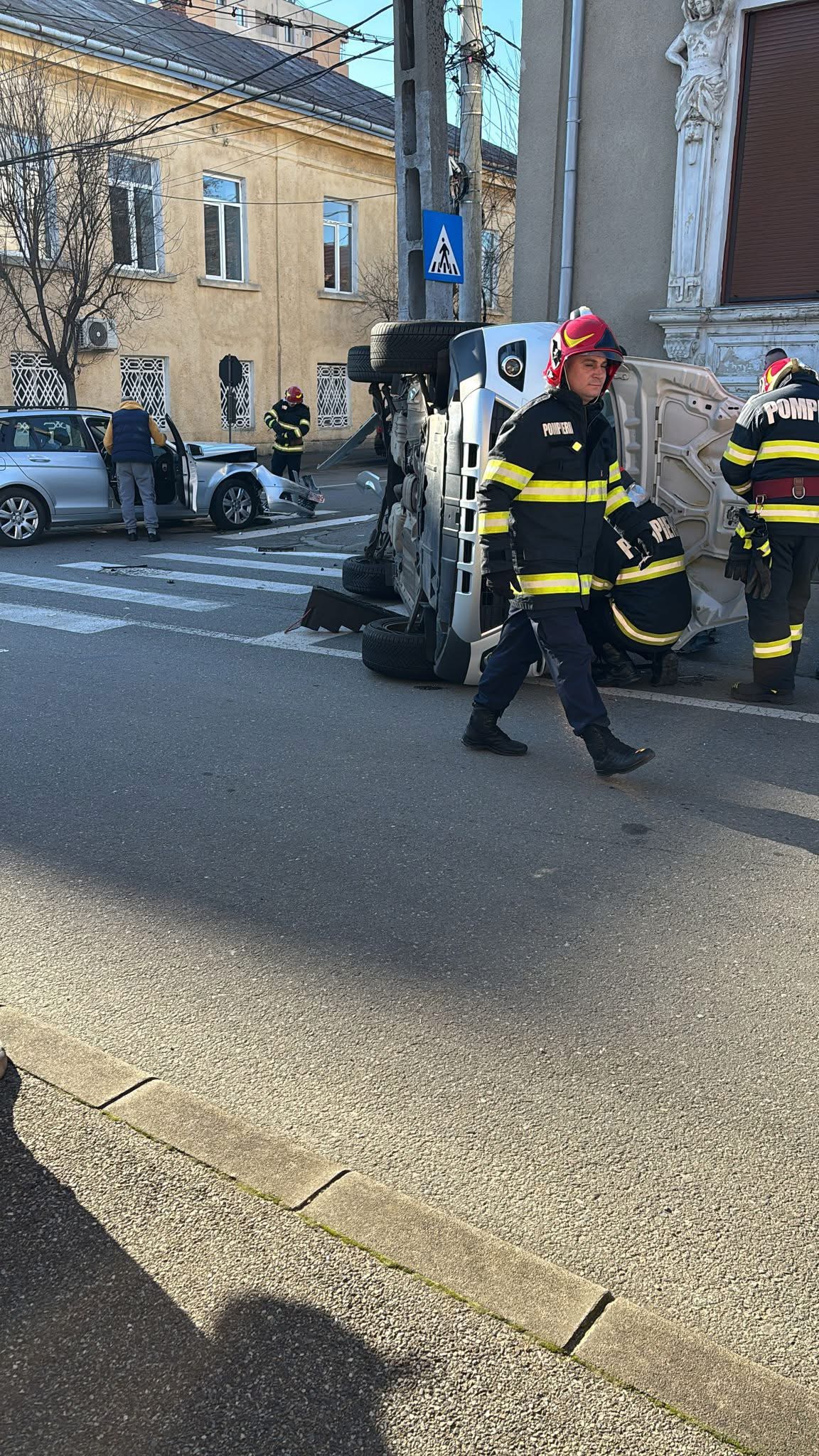 La volanul mașinii răsturnate se afla o femeie care a fost scoasă din mașină de șoferul vinovat de producerea accidentului, șoferița fiind transportată la spital.