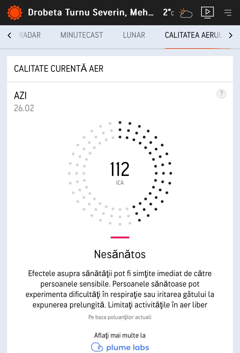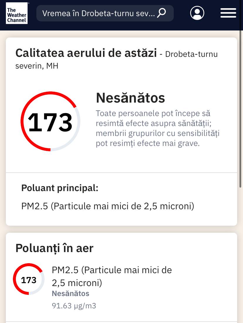 Indicele calității aerului urban din Drobeta-Turnu Severin a înregistrat valori ridicate în ultimele zile, fiind descris de aplicațiile oficiale de monitorizare drept „nesănătos”, cu concentrații crescute ale particulelor în suspensie PM2.5 și PM10.