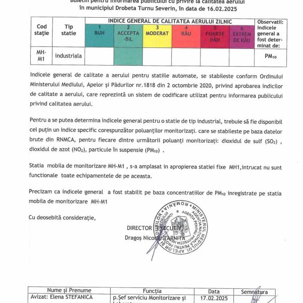 În contrast cu datele aplicațiilor, cel mai recent raport al Agenției pentru Protecția Mediului Mehedinți, din 16 februarie 2025, indică faptul că indicele general al calității aerului este „Acceptabil”. Acest indice a fost determinat pe baza concentrației PM10 măsurate la stația mobilă de monitorizare MH-M1.