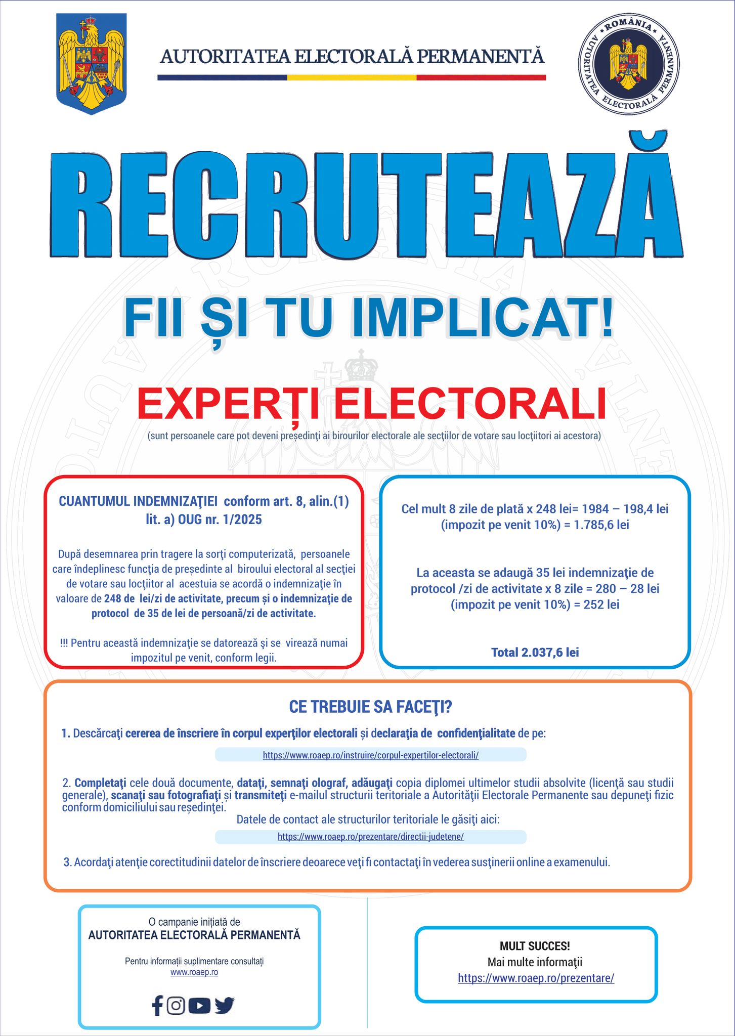Accesează: https://www.roaep.ro/instruire/corpul-expertilor-electorali/, pentru mai multe detalii.