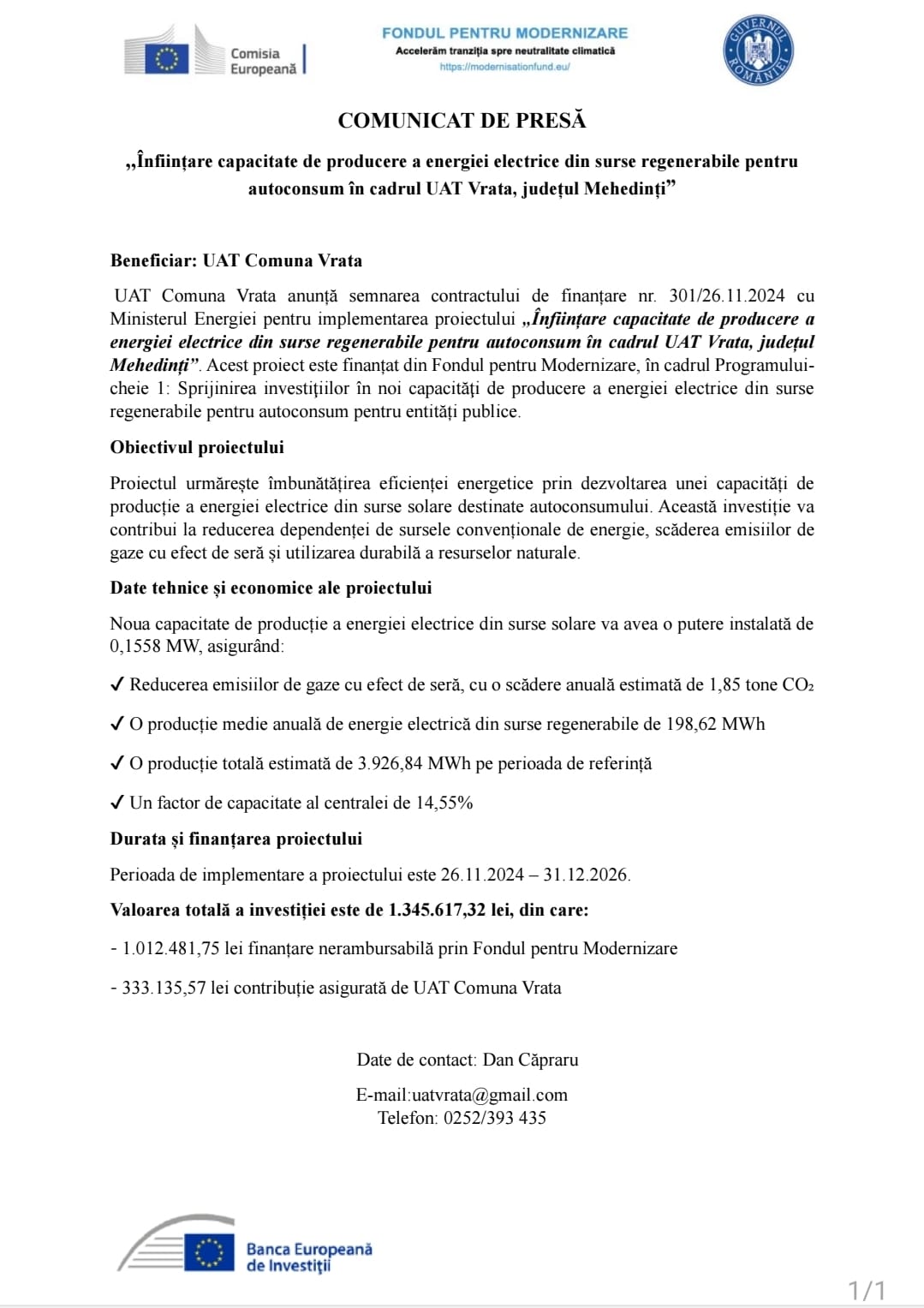 COMUNICAT DE PRESĂ – ,,Înființare capacitate de producere a energiei electrice din surse regenerabile pentru autoconsum în cadrul UAT Vrata, județul Mehedinți”