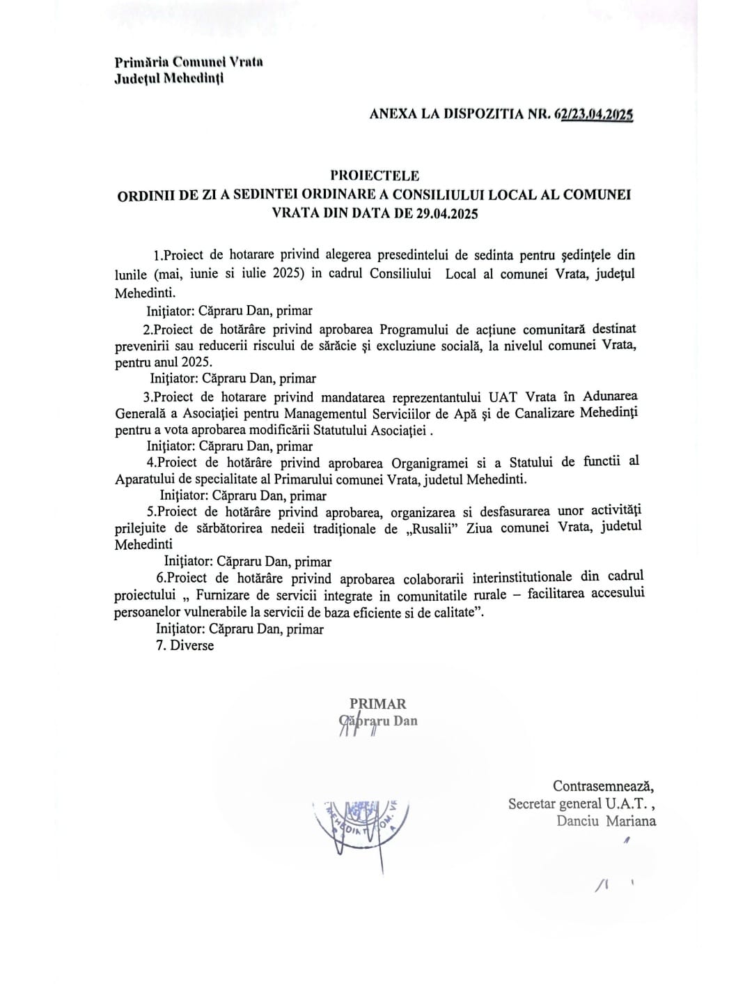 În cadrul ședinței ordinare a Consiliului Local al comunei Vrata, județul Mehedinți, desfășurată în data de 29 aprilie 2025, au fost aprobate următoarele proiecte de hotărâre: