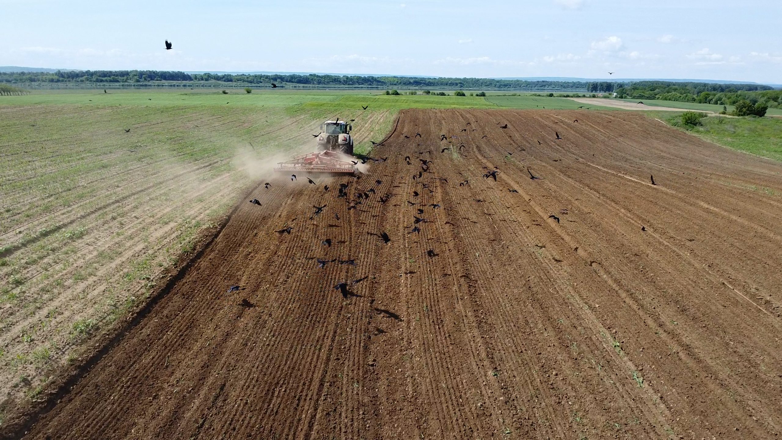 Imaginile surprinse din dronă arată proporțiile fenomenului: câmpuri întregi urmărite de stoluri negre, în timp ce utilajele lucrează terenul. Cele mai afectate sunt exploatațiile mari, unde pagubele se ridică la zeci de mii de lei.