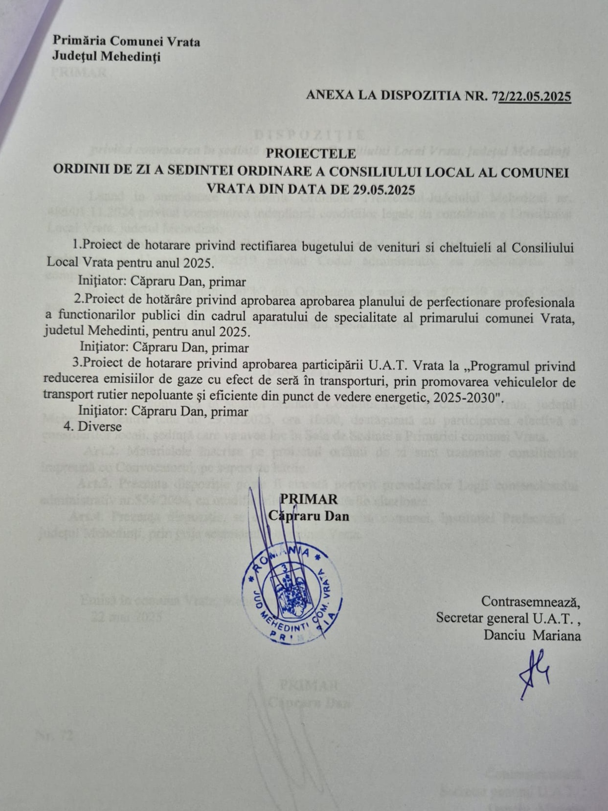 Consilierii locali ai comunei Vrata, județul Mehedinți, s-au întrunit miercuri, 29 mai 2025, în cadrul unei ședințe ordinare desfășurate în Sala de Ședințe a Primăriei. Toate cele trei proiecte de hotărâre aflate pe ordinea de zi, inițiate de primarul Căpraru Dan, au fost aprobate.