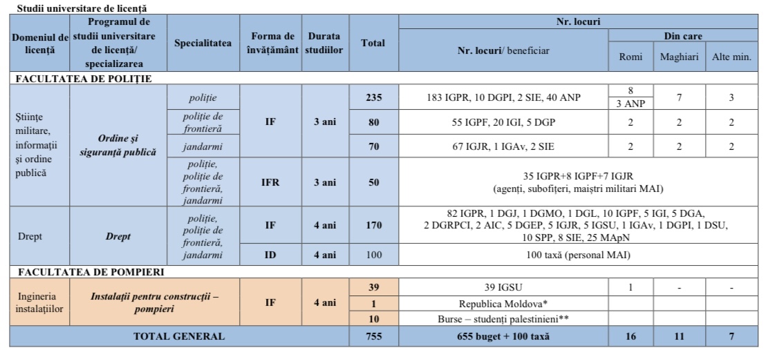 – ordine publică – 70 locuri – perioadă studiilor 3 ani;