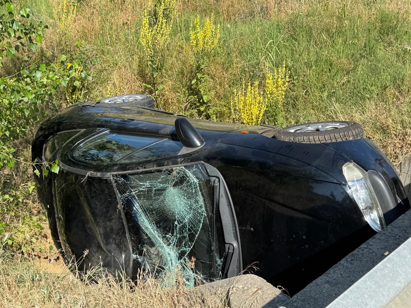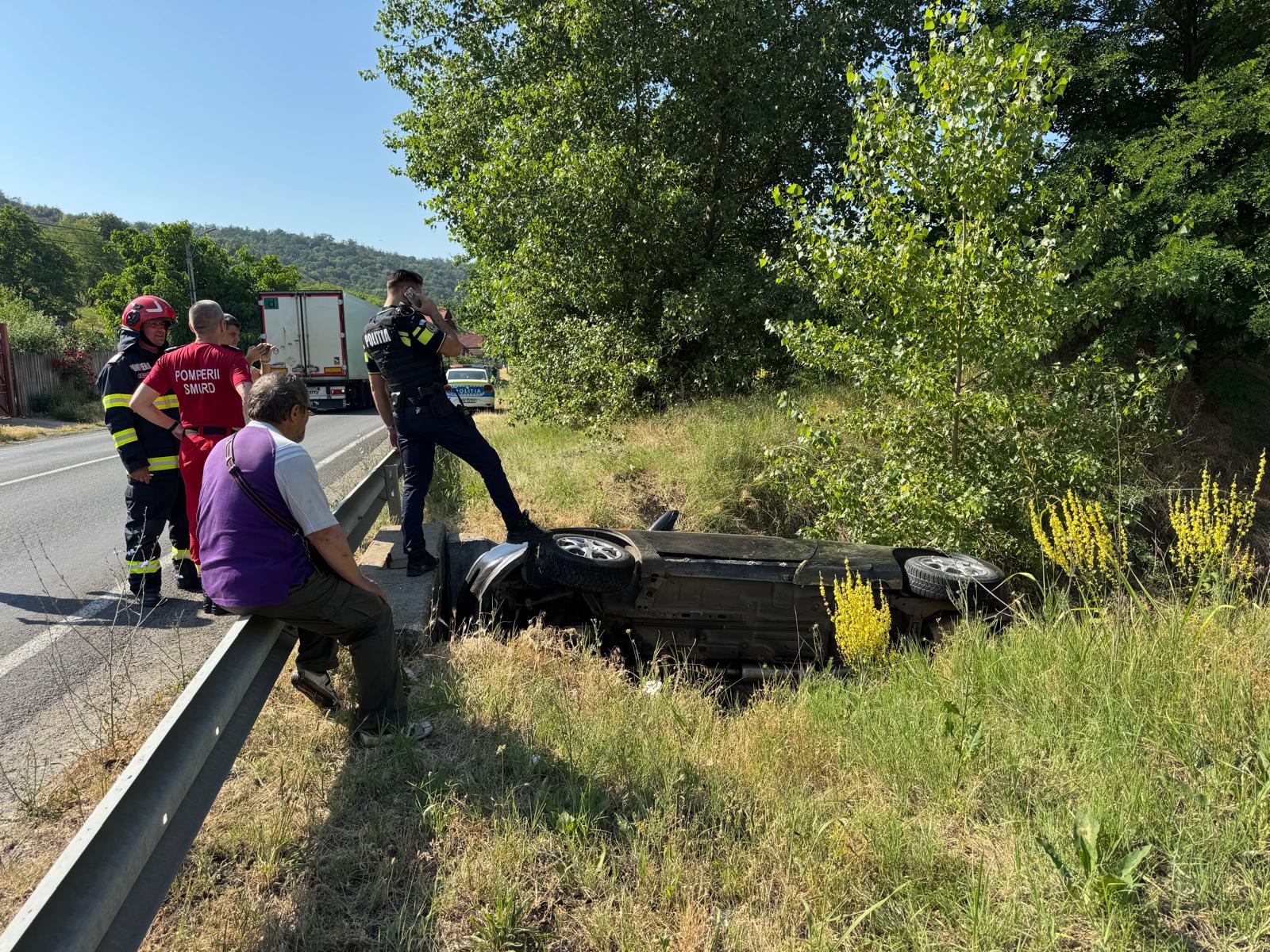 Bărbatul aflat la volanul unui autoturism, a pierdut controlul direcției, a lovit parapetul de protecție și s-a răsturnat în afara carosabilului.
