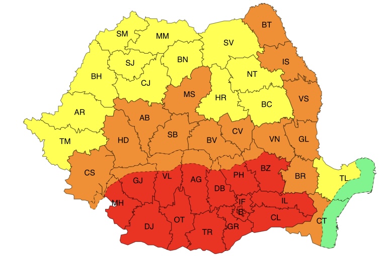 Totodată, județul se află sub avertizare Cod Roșu de caniculă și disconfort termic accentuat, valabilă până mâine. Temperaturile maxime se vor situa între 38 și 41°C, iar indicele temperatură-umezeală (ITU) va depăși pragul critic de 80 de unități.