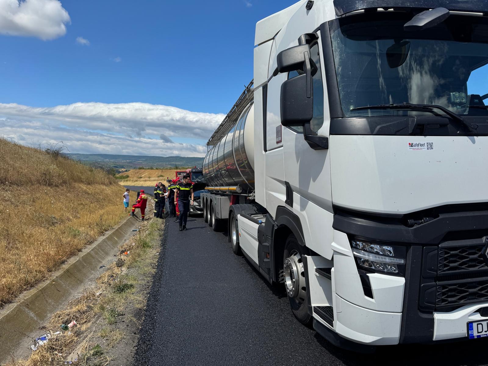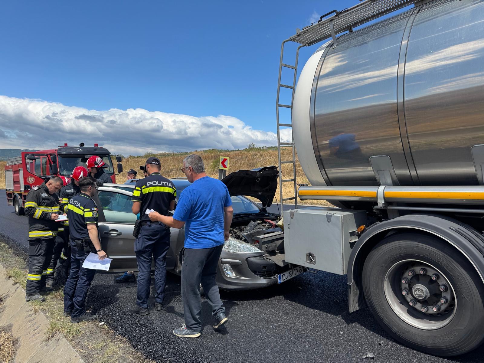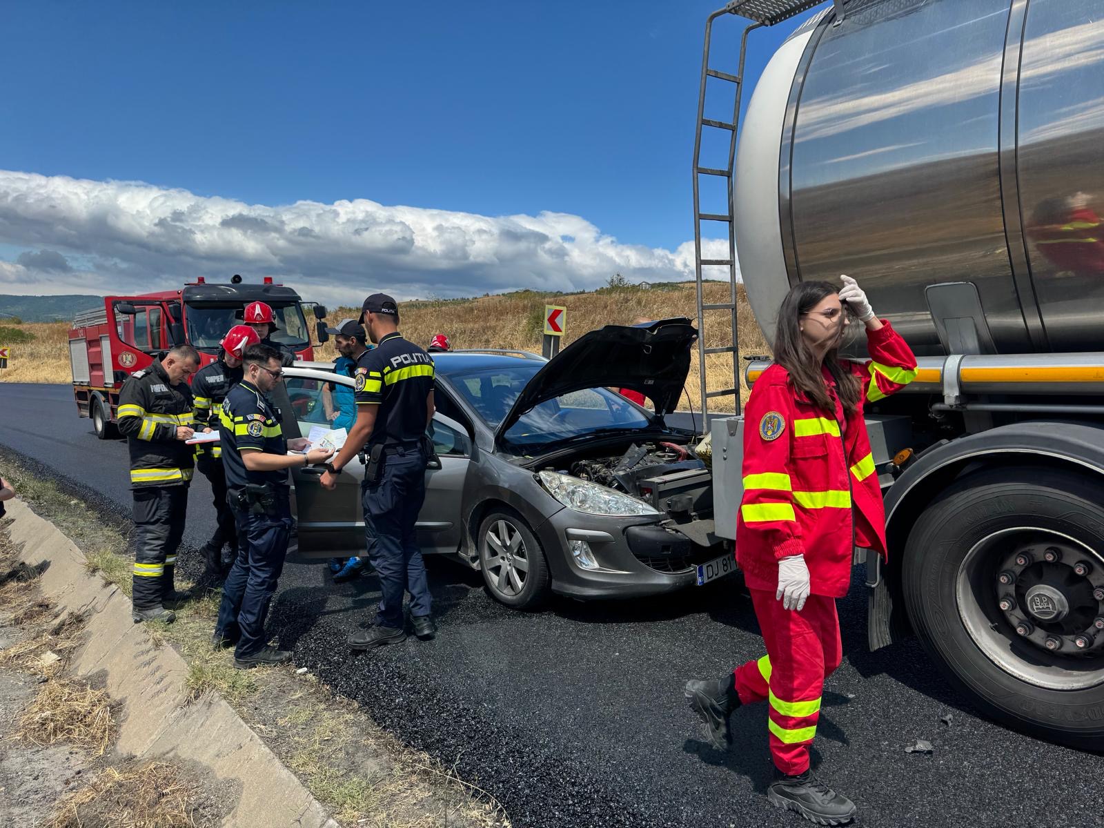 Un autoturism în care se afla o familie cu doi copii a intrat în coliziune cu o autocisternă oprită în dreptul unui semnal cu paletă, folosit de muncitorii prezenți pe șantier. Șoferul autoturismului nu a observat la timp oprirea cisternei și a lovit vehiculul greu din spate.