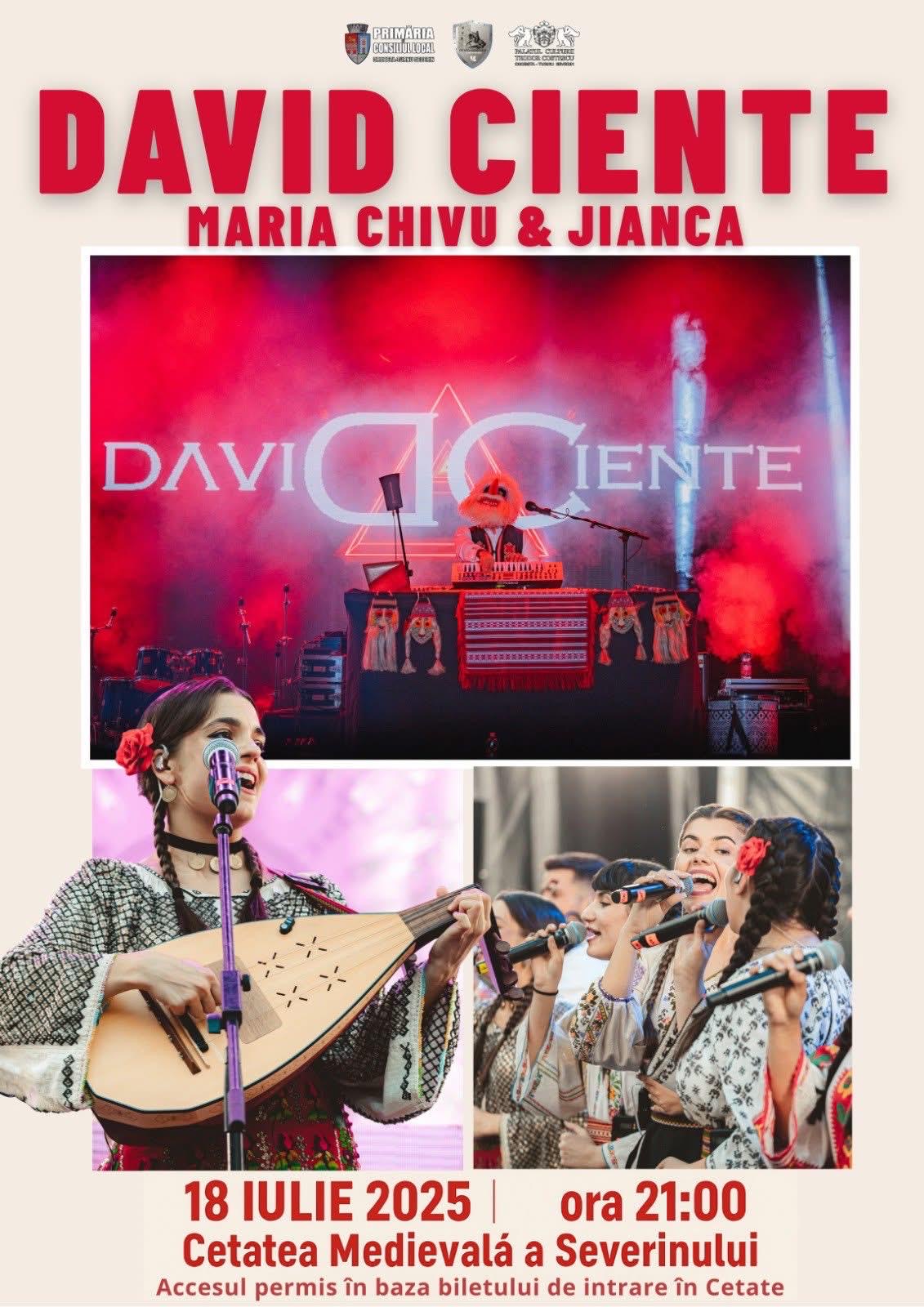 Vineri, 18 iulie, de la ora 21:00, în Cetatea Medievală va avea loc un concert special cu participarea artiștilor David Ciente, Maria Chivu și Jianca. Accesul se face în baza biletului de intrare în cetate.