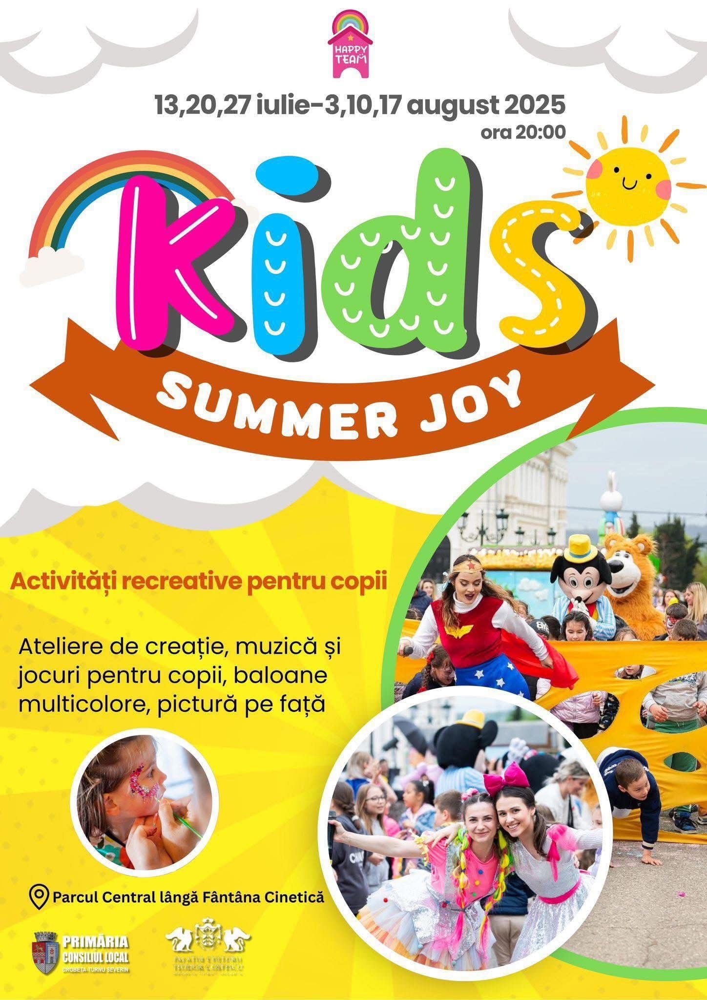 Duminică, 20 iulie, de la ora 20:00, copiii sunt așteptați tot în Parcul Central, la o nouă ediție „Kids Summer Joy”. Programul cuprinde ateliere creative, pictură pe față, jocuri interactive și alte activități de divertisment.