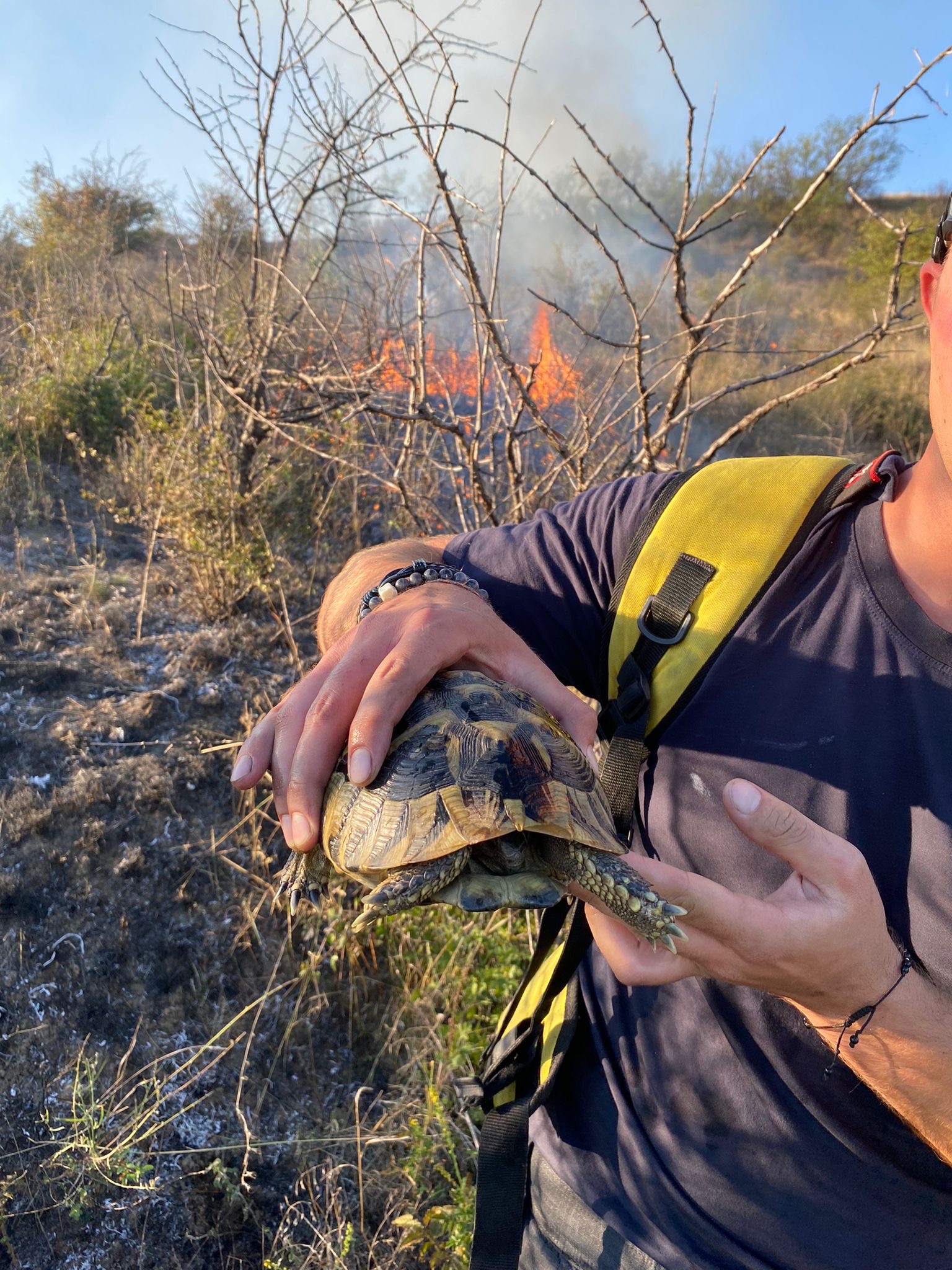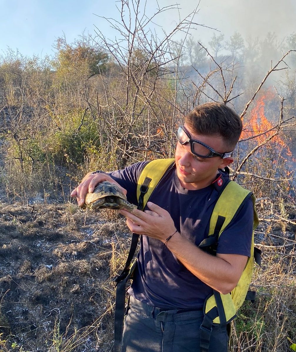 Printre fum și jar, doi pompieri — soldat Moraru Renaldo Marian și soldat Afrim Cătălin — au reușit să salveze o mică țestoasă care se târa neajutorată prin iarba deasă
