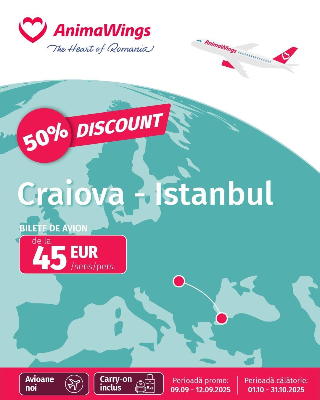 Compania românească AnimaWings a anunțat introducerea zborurilor directe Craiova–Istanbul, începând cu 3 octombrie 2025. Cursele vor fi operate de două ori pe săptămână, luni și vineri.