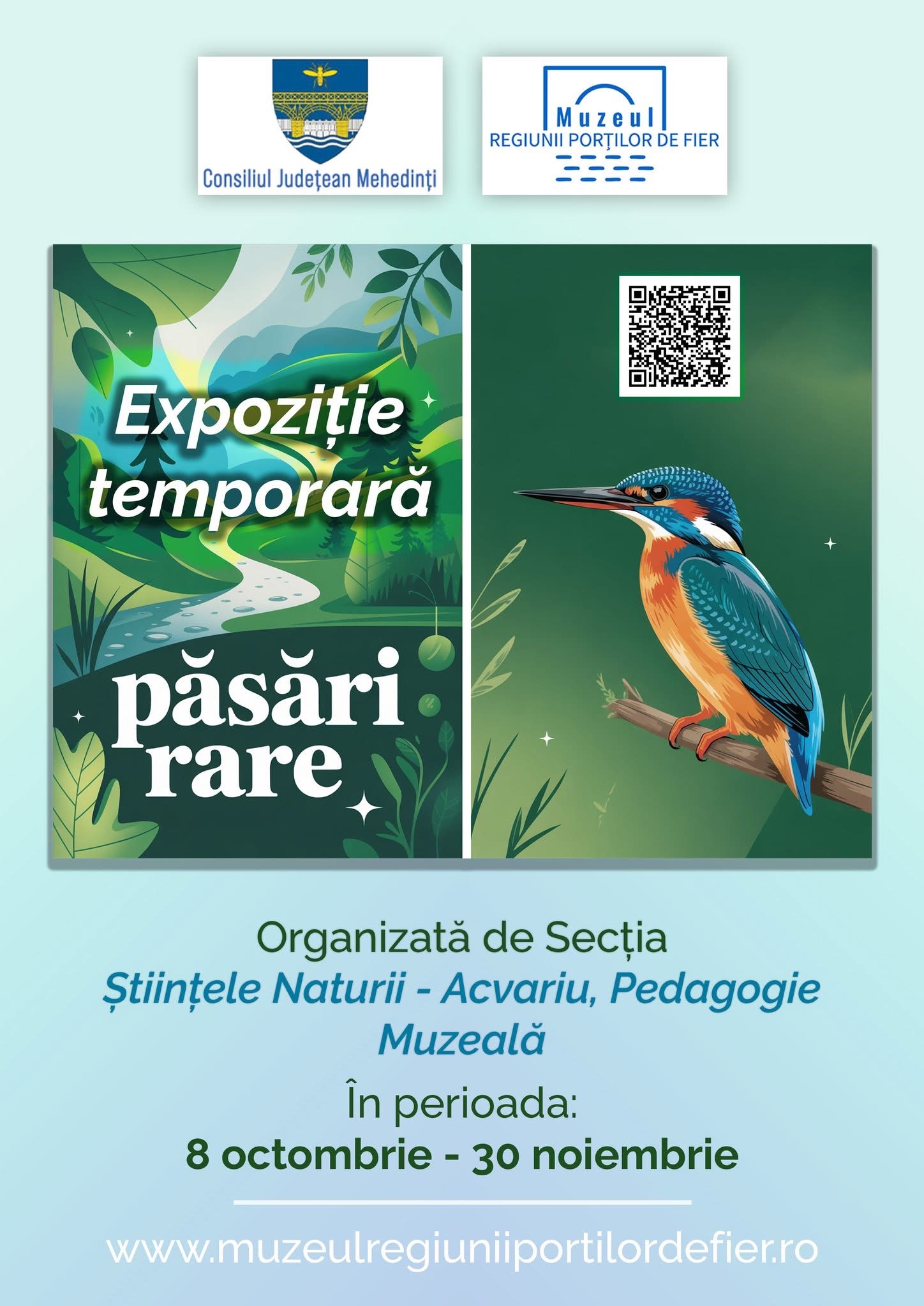 În perioada 8 octombrie – 30 noiembrie 2025, Muzeul Regiunii Porților de Fier găzduiește, în holul central, expoziția temporară „Păsări rare”, realizată de specialiștii Secției Științele Naturii – Acvariu și Pedagogie Muzeală.