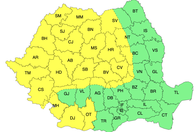 Administrația Națională de Meteorologie (ANM) a emis joi două avertizări cod galben de vânt puternic, ce intră în vigoare din această noapte și rămân valabile până vineri seara. Zonele vizate sunt mare parte din vestul și centrul României, dar și Oltenia, unde rafalele vor atinge local viteze de furtună.