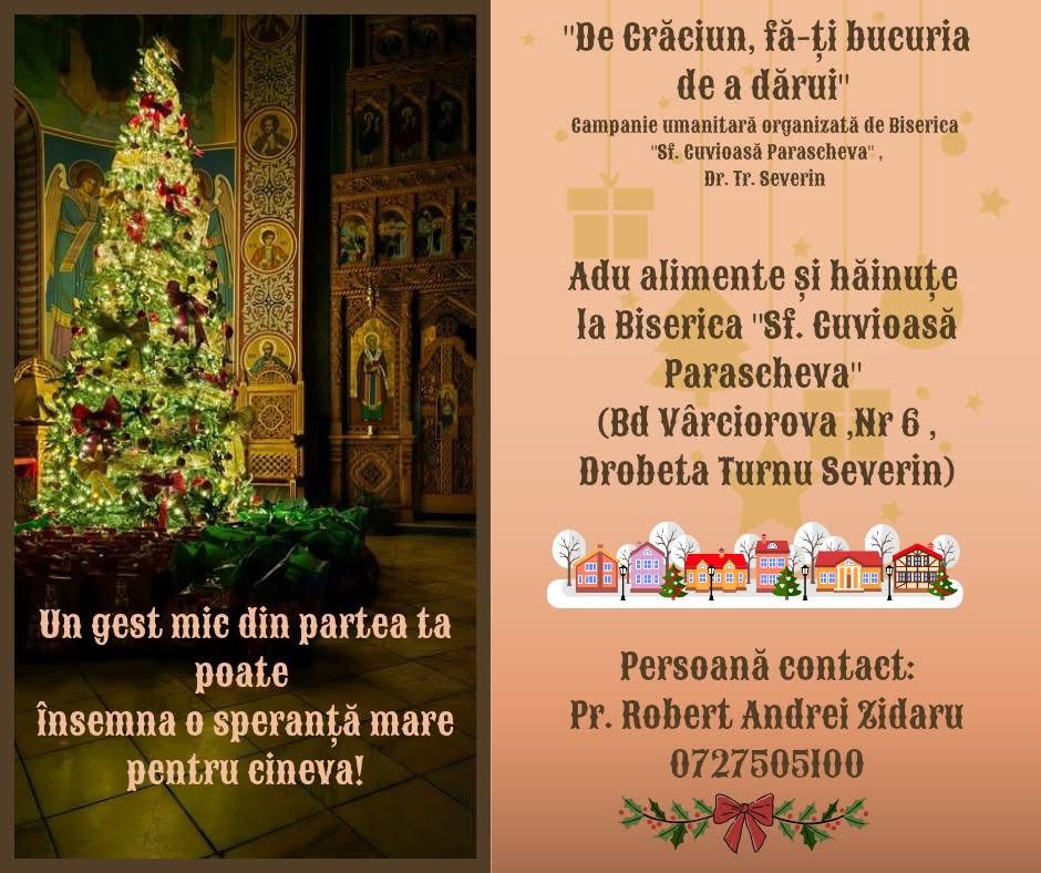 La începutul lunii noiembrie, când gândul tuturor se îndreaptă spre sărbătorile de iarnă, părintele Robert Andrei Zidaru de la Biserica „Sfânta Cuvioasă Parascheva” din Drobeta-Turnu Severin lansează un apel simplu, dar plin de înțeles: