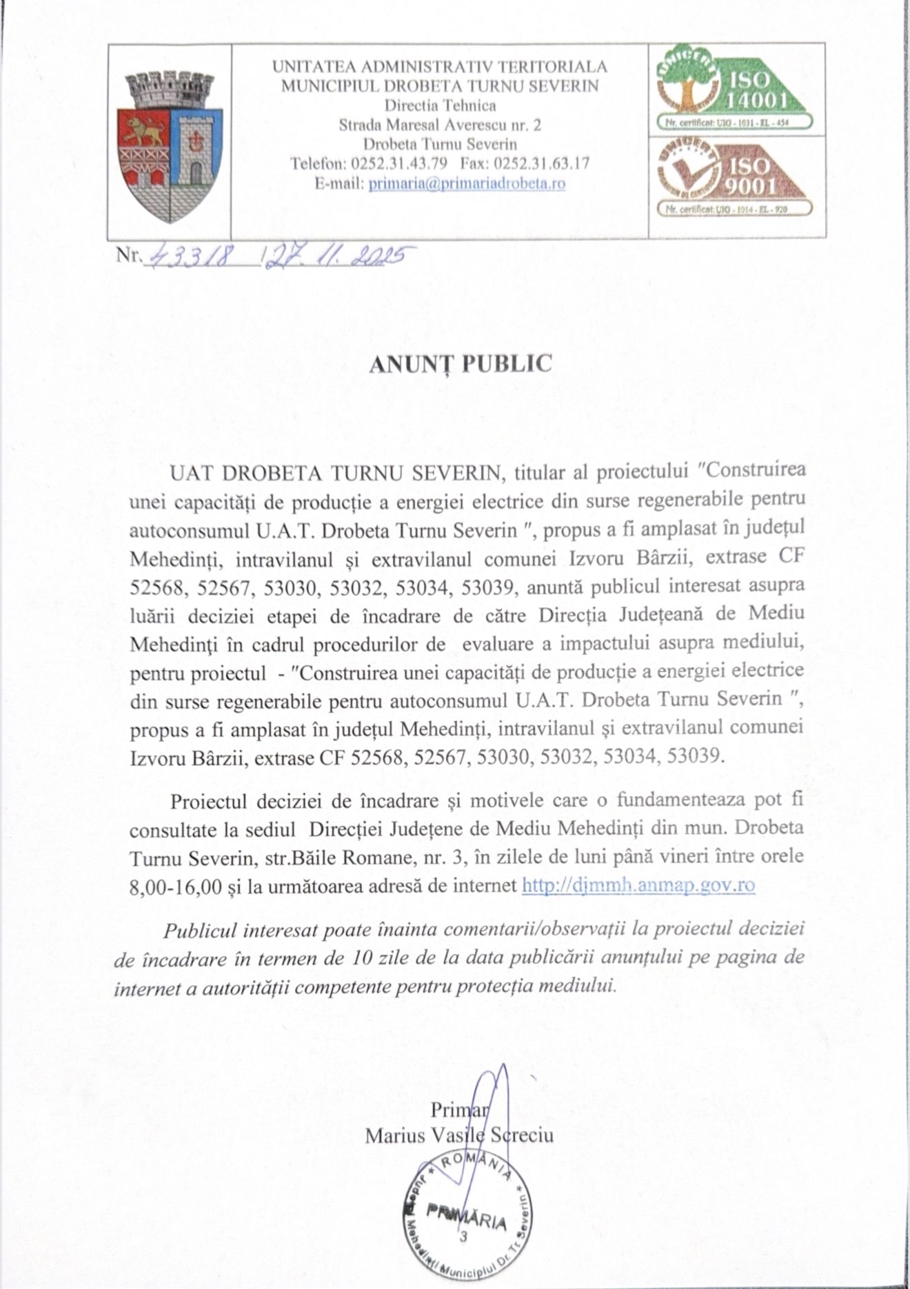 ANUNȚ PUBLIC- UAT DROBETA TURNU SEVERIN