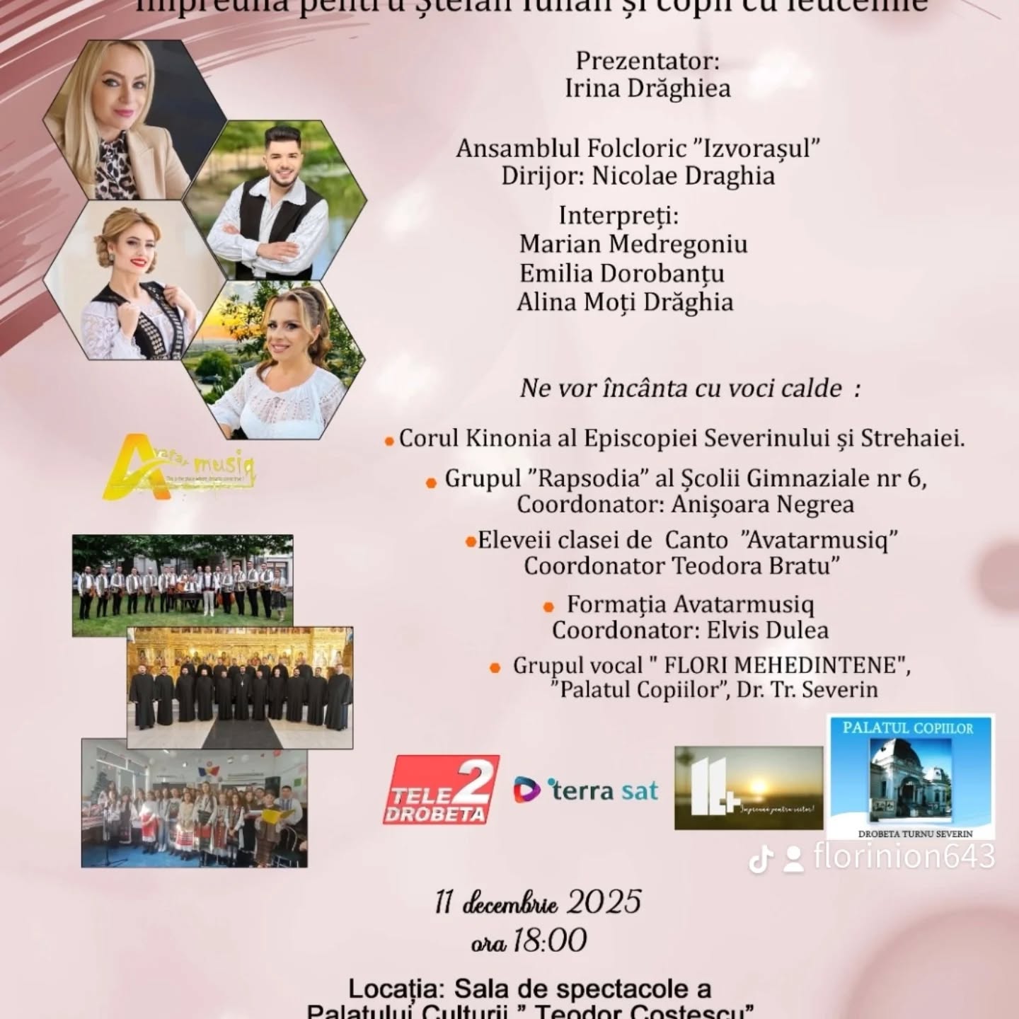 În fața unei cauze atât de sensibile, artiști consacrați și tineri talentați din județ și-au anunțat prezența pe scenă. Alina Moți Drăghia, Marian Medregoniu și Emilia Dorobanțu vor oferi momente muzicale autentice, în timp ce Ansamblul Izvorașul, Grupul Vocal „Flori Mehedințene”, Formația de Canto „Avatarmusiq” și Grupul ,,Rapsodia” al Școlii Gimnaziale Nr.6, vor aduce energie și speranță prin fiecare interpretare. De asemenea, Corul Kinonia al Episcopiei Severinului și Strehaiei va completa seara cu un repertoriu dedicat solidarității și sprijinirii celor aflați în suferință.
