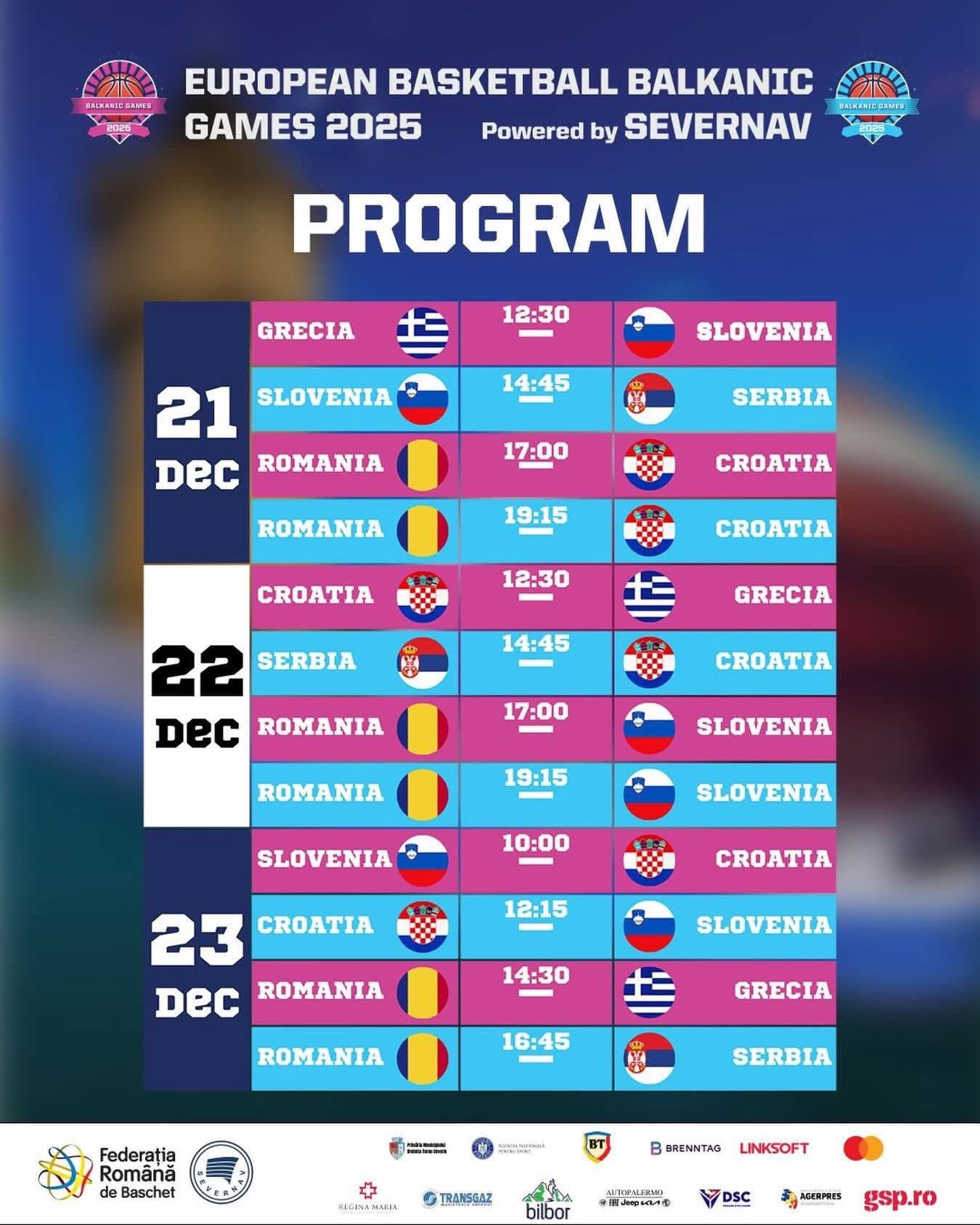 Competiția internațională European Basketball Balkanic Games 2025 – Baschet U15 se desfășoară, în aceste zile, la Drobeta-Turnu Severin, reunind echipe naționale de juniori din România, Grecia, Croația, Slovenia și Serbia.
