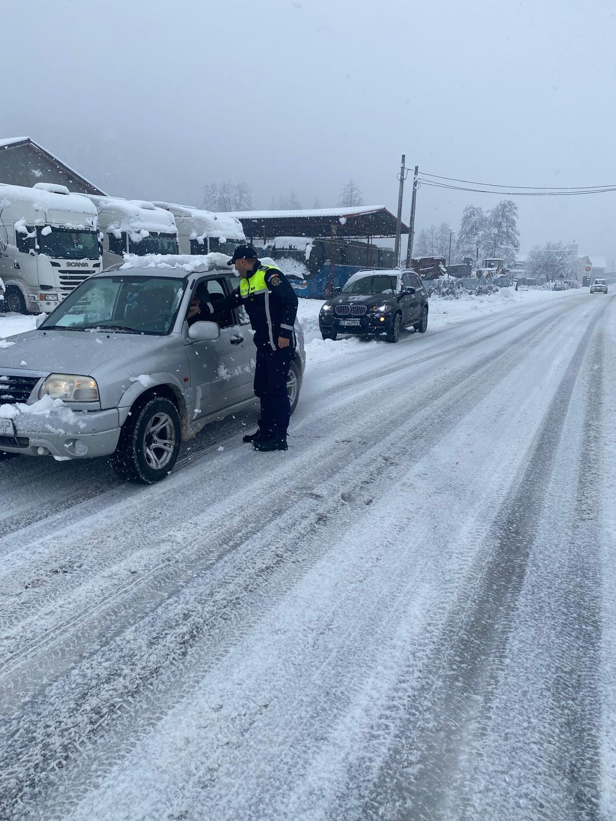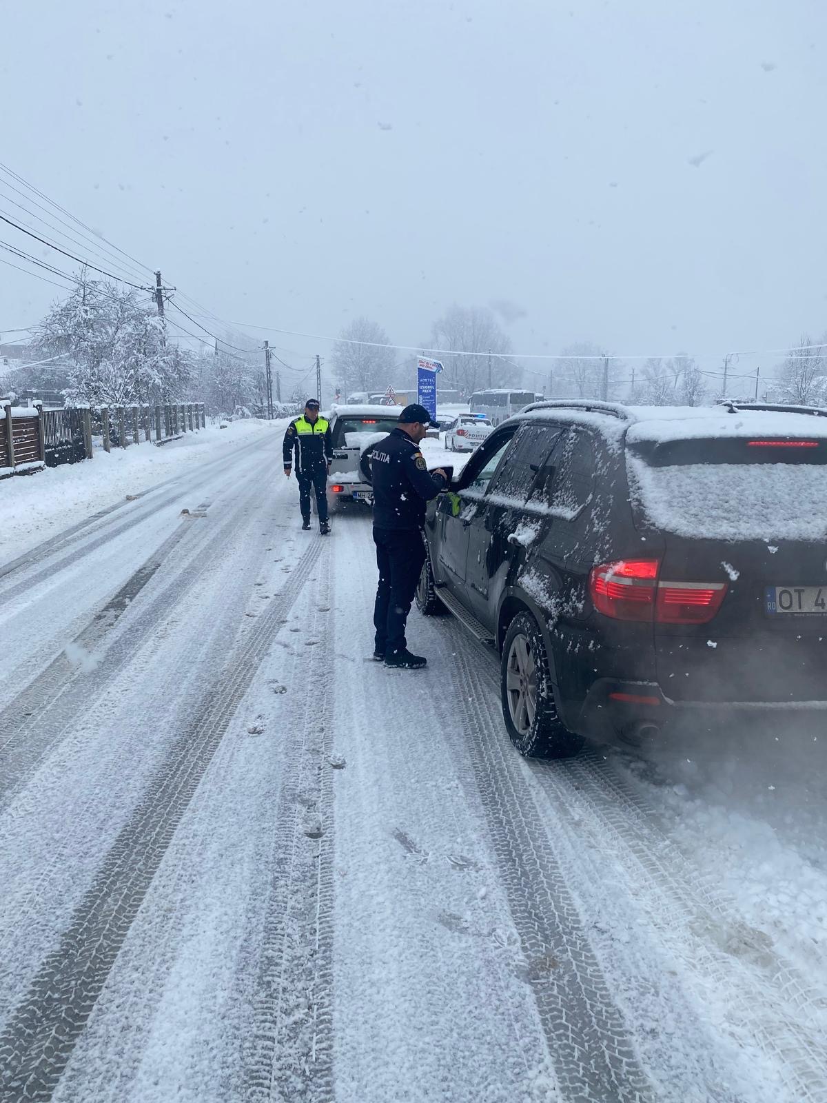 În urma controalelor efectuate, doi conducători auto au fost sancționați contravențional, iar certificatele de înmatriculare le-au fost reținute, deoarece autoturismele nu erau echipate cu anvelope de iarnă adecvate sectorului de drum pe care circulau.