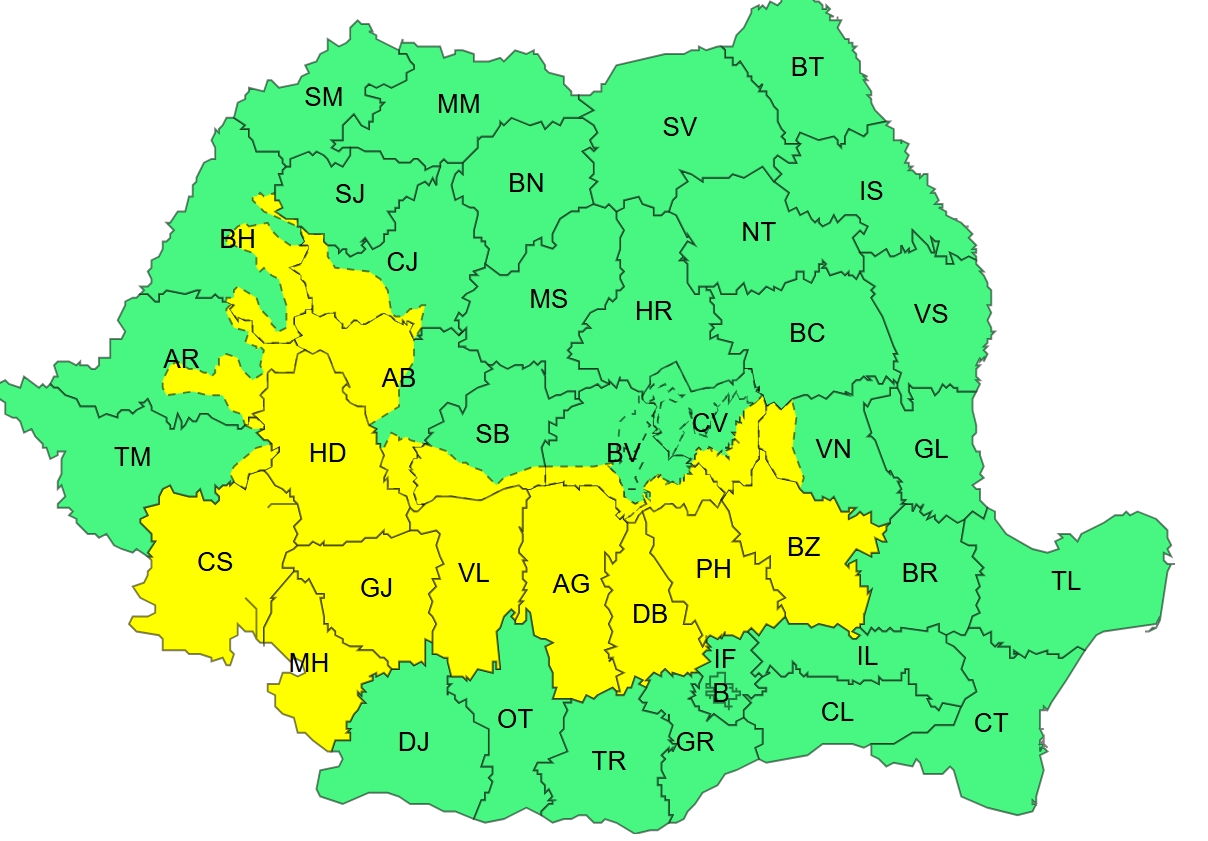 În zonele montane situate la altitudini de peste 1.700 de metri, precipitațiile vor fi sub formă de ninsoare, urmând să se depună un strat de zăpadă de 20–30 de centimetri. Vântul va avea intensificări semnificative, cu rafale de 70–90 km/h, ceea ce va duce temporar la viscolirea zăpezii și scăderea vizibilității sub 100 de metri.