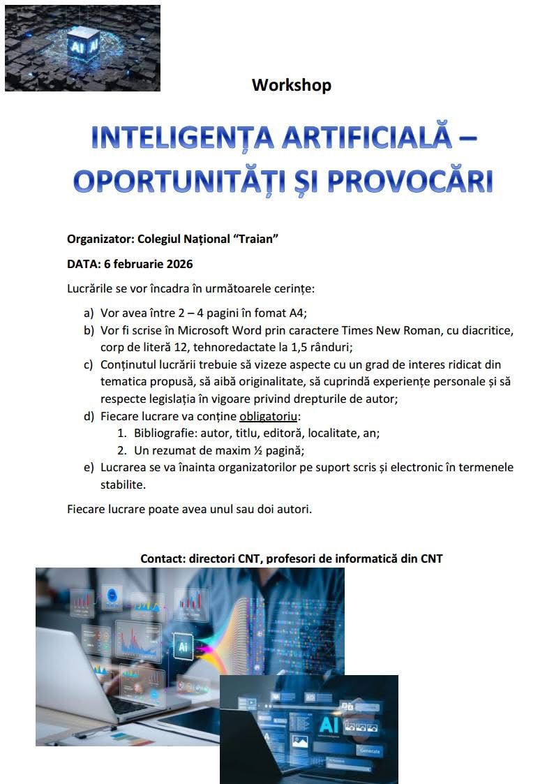 Profesorii din Mehedinți sunt invitați, pe 6 februarie 2026, la un workshop dedicat Inteligenței Artificiale și modului în care aceasta poate fi folosită în educație. Evenimentul este organizat de Colegiul Național „Traian”, împreună cu Casa Corpului Didactic Mehedinți, și se adresează cadrelor didactice interesate să înțeleagă mai bine noile tehnologii.