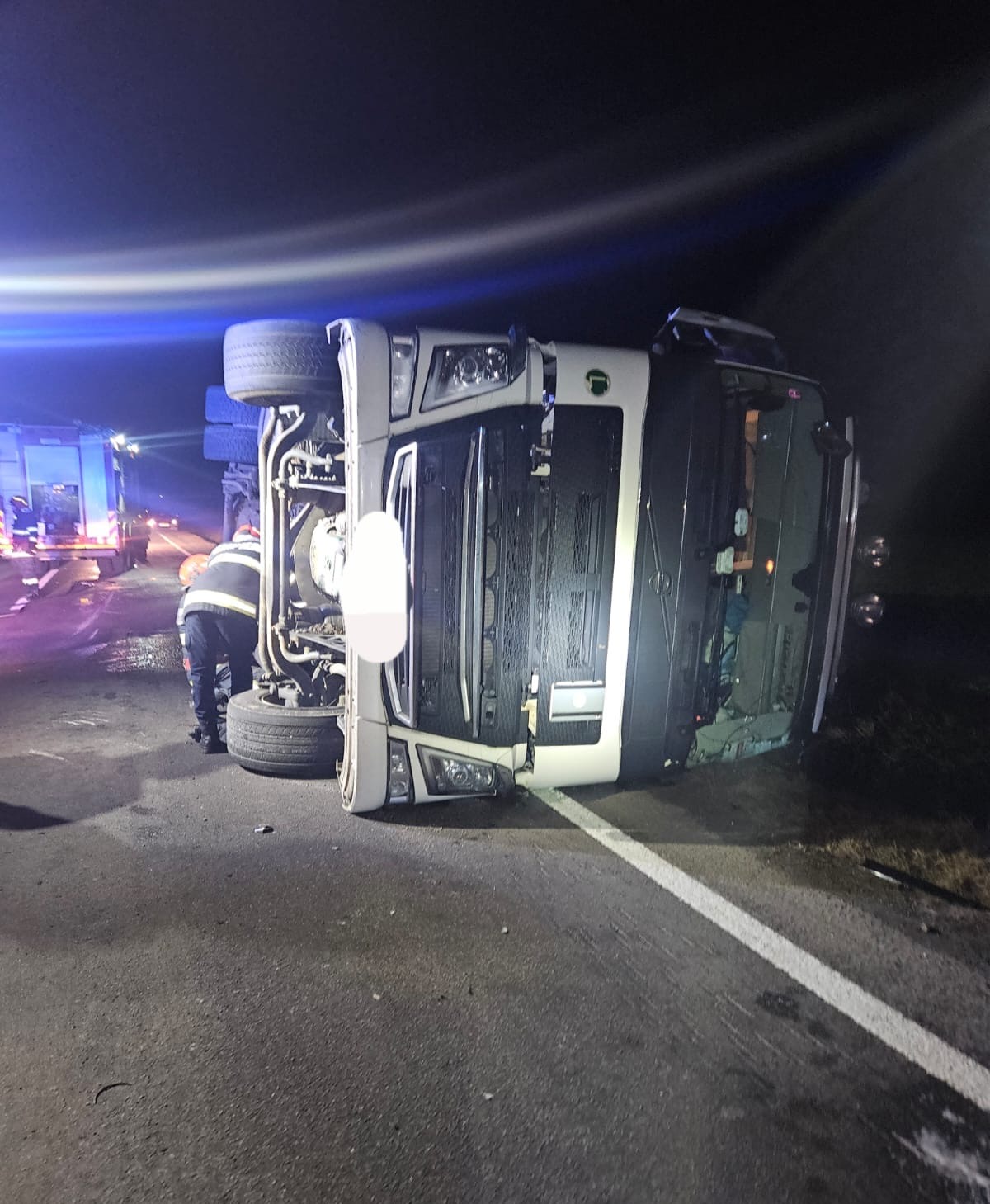 Un accident rutier s-a produs în această seară pe DN 56A, în localitatea Punghina, județul Mehedinți. Un autotren s-a răsturnat în afara părții carosabile, fiind necesară intervenția pompierilor.