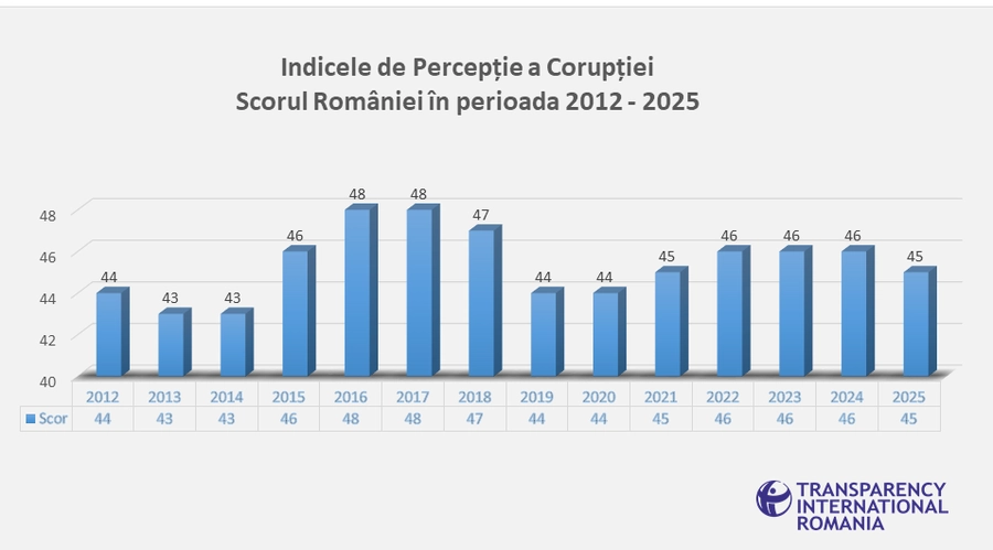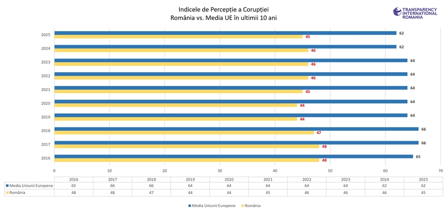 România rămâne, și în 2025, printre țările din Uniunea Europeană unde corupția este percepută ca fiind foarte ridicată, arată cel mai recent raport al organizației Transparency International.