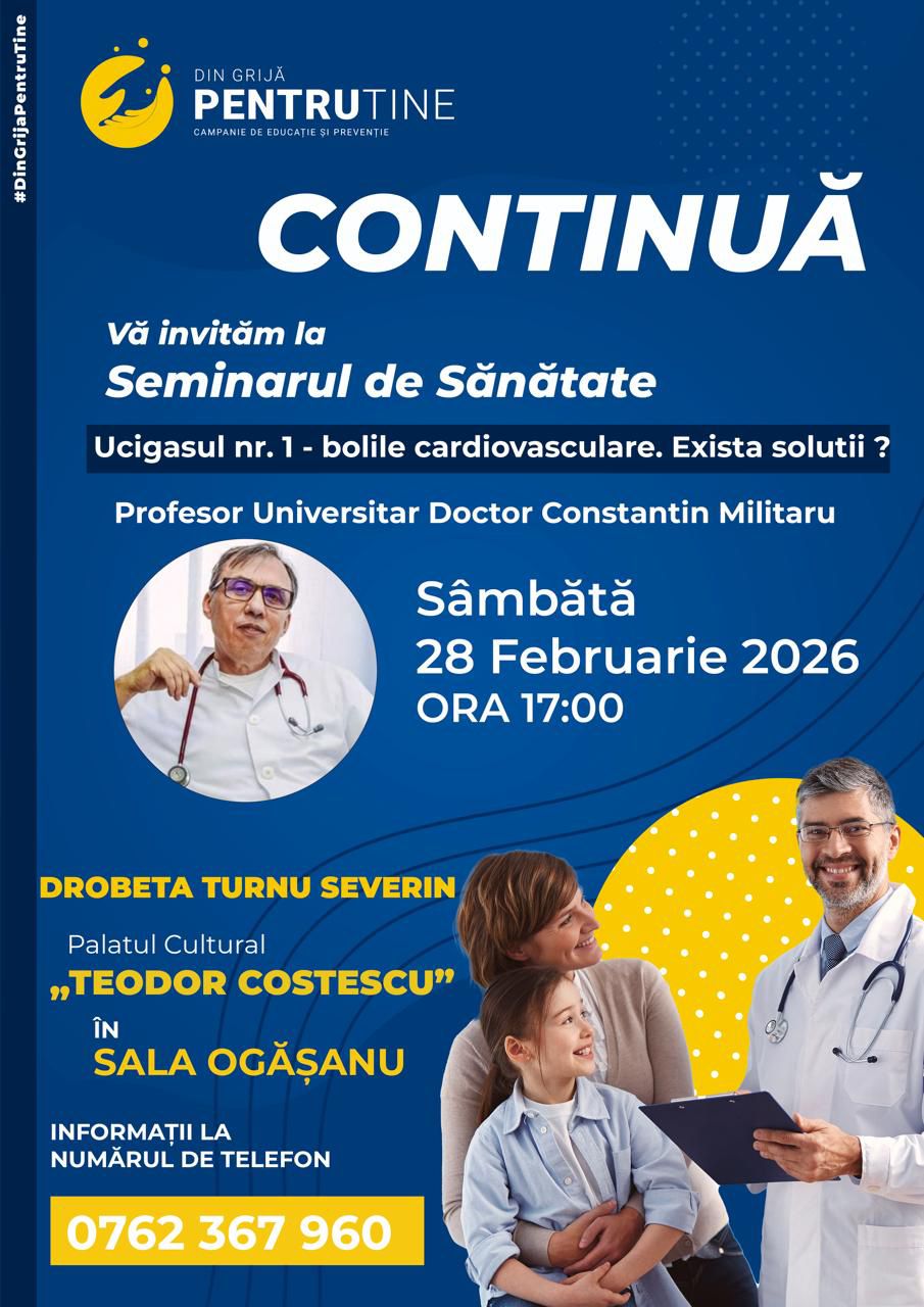 Bolile de inimă și de vase de sânge sunt principala cauză de deces, atât în România, cât și la nivel mondial. Tocmai de aceea, severinenii sunt invitați la un seminar de sănătate dedicat prevenirii acestor afecțiuni, organizat în cadrul campaniei „Din grijă pentru tine”.