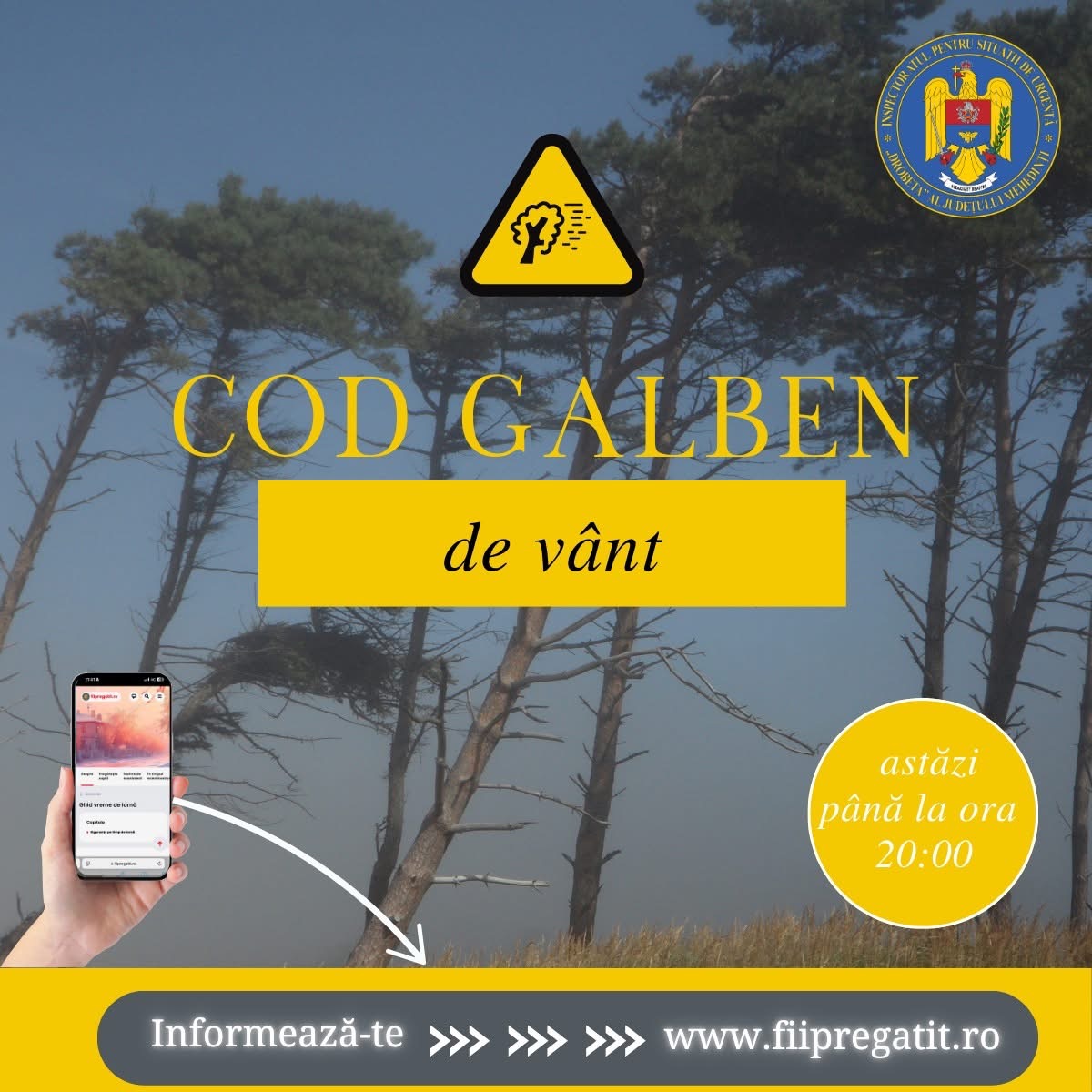 Potrivit informării, vântul va sufla cu putere, atingând la rafală viteze de 50 până la 70 km/h, existând riscul producerii unor pagube materiale și al punerii în pericol a siguranței.