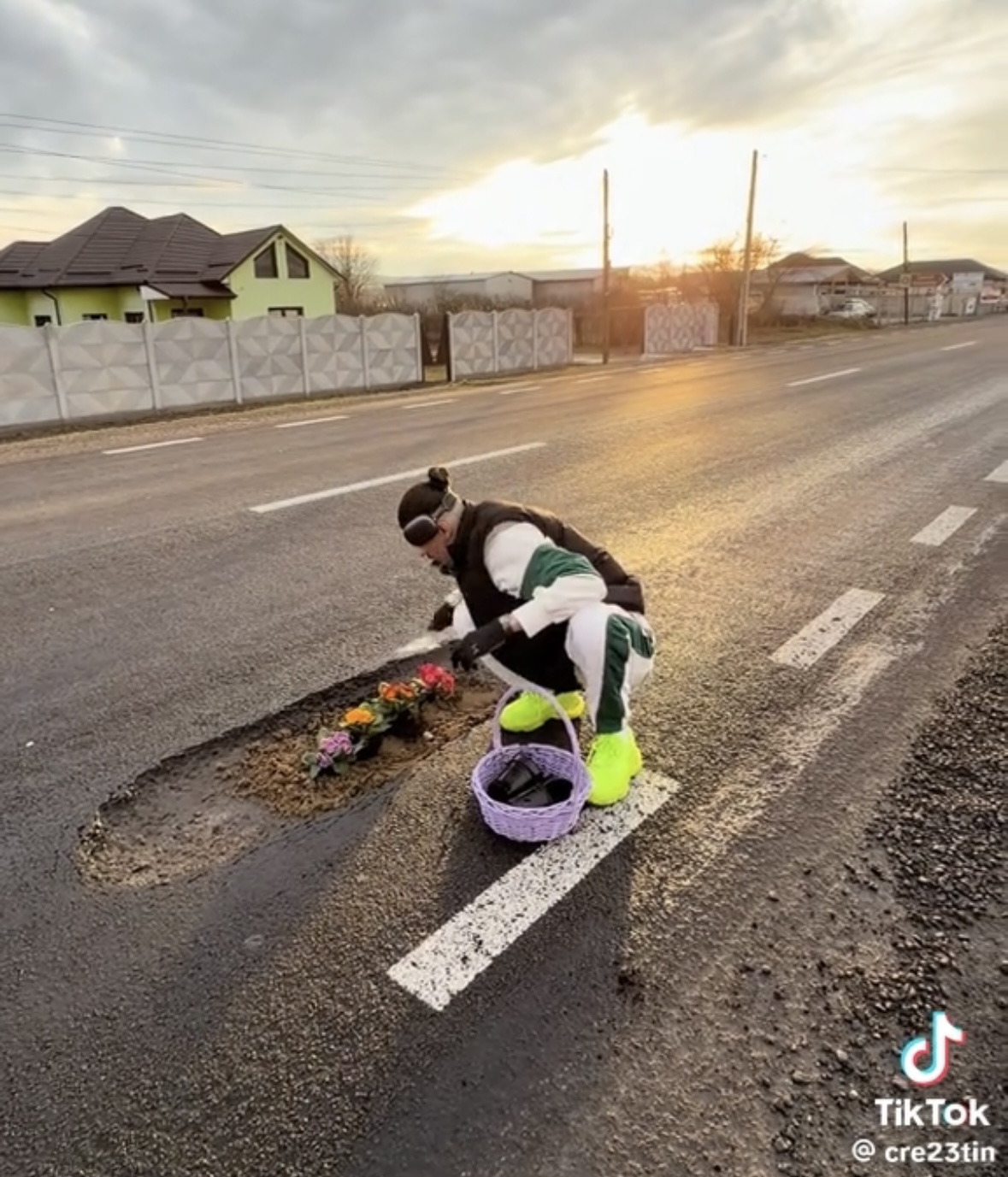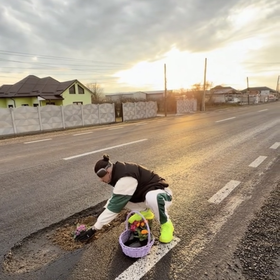 Fără a se enerva din cauza faptului că și-a stricat cauciucul, acesta a făcut haz de necaz. A luat din portbagaj câteva ghivece cu flori pe care le avea la el și le-a “plantat” în mijlocul craterului format în carosabil. Ceilalți participanți la trafic au privit scena cu zâmbetul pe buze, iar unii au imortalizat momentul.