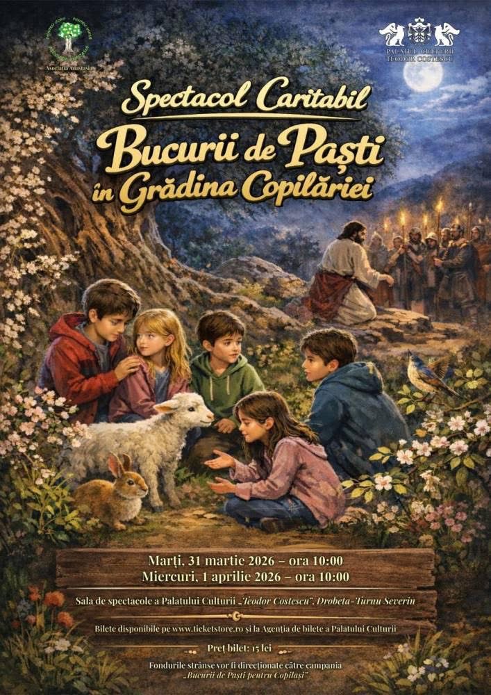 Un eveniment caritabil dedicat copiilor din familii cu posibilități materiale reduse va avea loc la sfârșitul lunii martie, în Drobeta-Turnu Severin. Departamentul de tineret „Youth Action” al Asociației Anastasia organizează spectacolul „Bucurii de Paști în Grădina Copilăriei”, un eveniment prin care comunitatea este invitată să se implice într-o campanie umanitară.