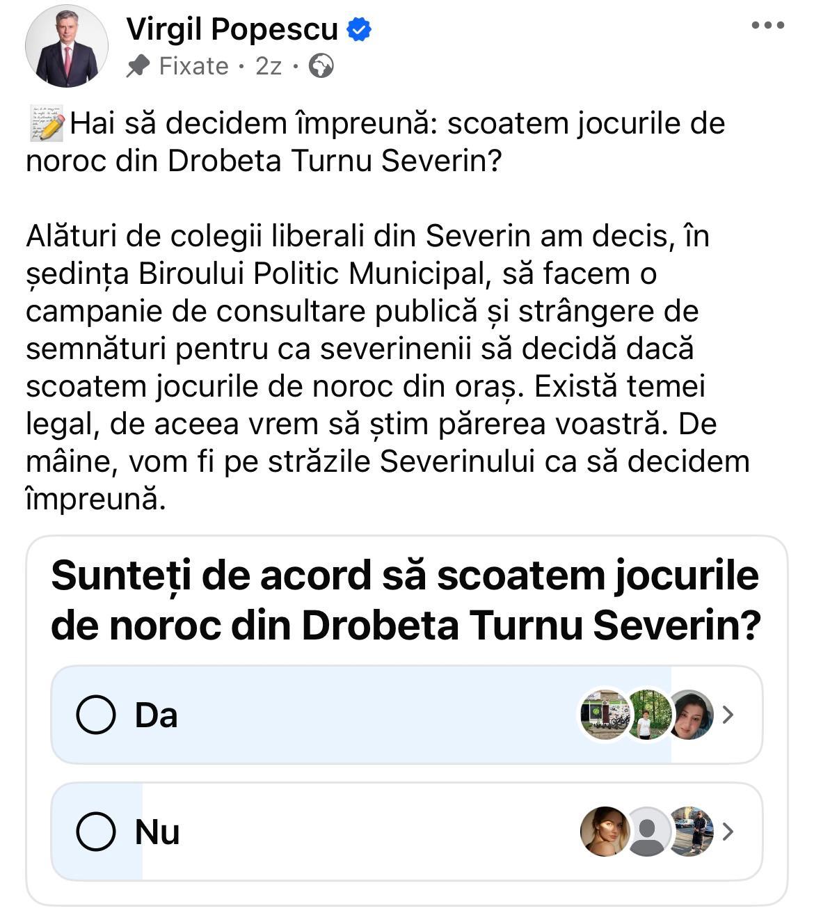 Virgil Popescu a dat startul unui nou spectacol de imagine la Drobeta-Turnu Severin: marea cruciadă împotriva păcănelelor. Cu un aer de salvator al moralității publice, echipa PNL bate la ușile oamenilor după semnături, sperând că severinenii au memoria scurtă și buzunarele pline (deși ultimele au fost golite constant de facturile la energie girate chiar de el).
