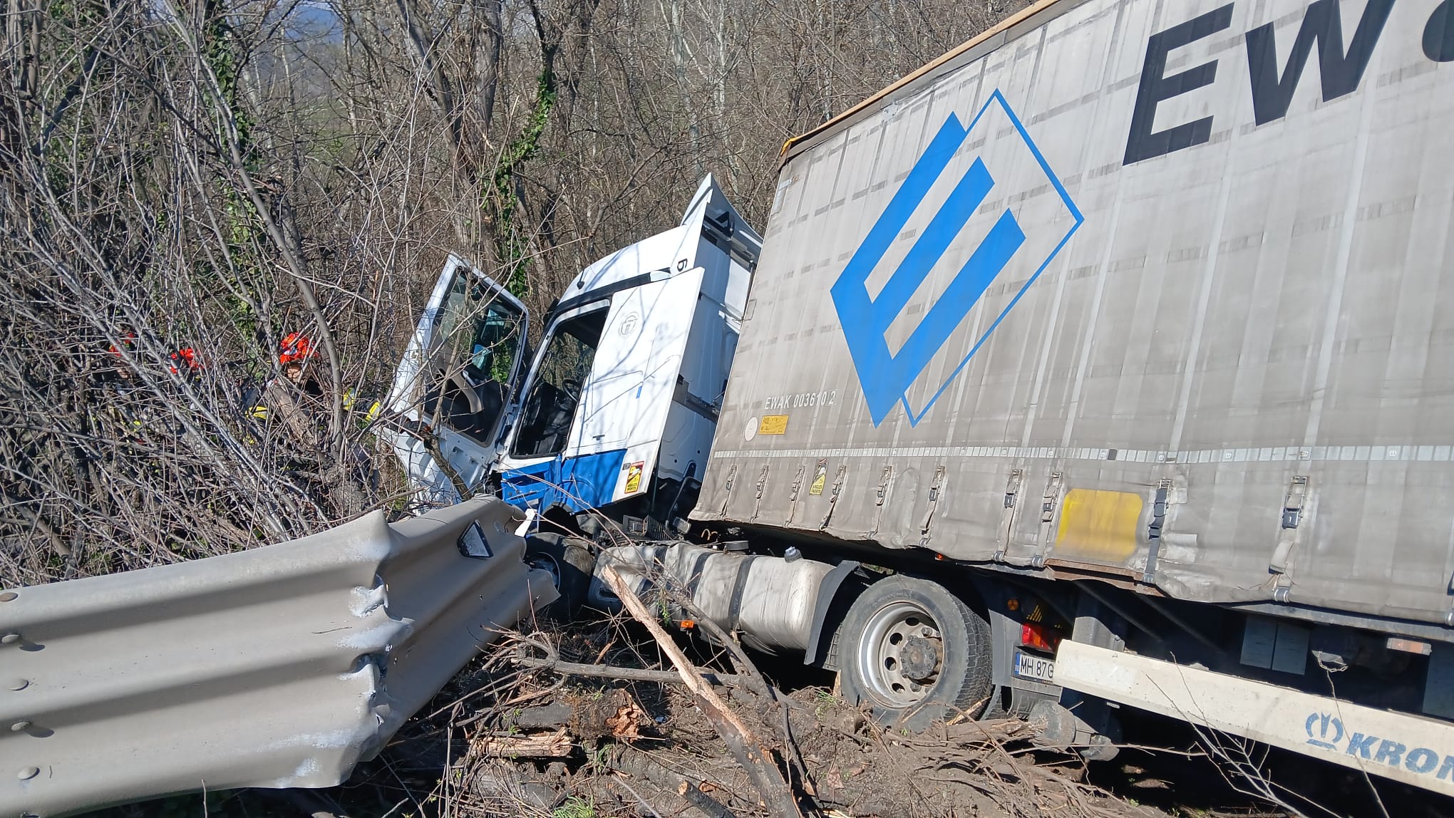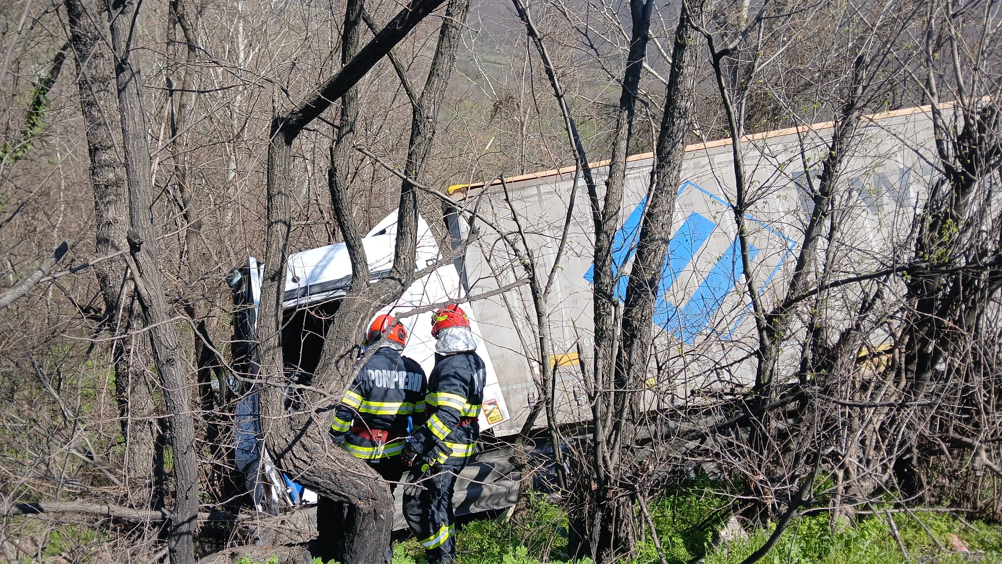 Intervenție în desfășurare pe DN 6! Secția de Pompieri Orșova intervine în aceste momente la un accident rutier produs în zona Pasajului Valea Cernei, unde un TIR s-a răsturnat în afara părții carosabile. Forțele de intervenție au ajuns prompt la locul evenimentului, iar șoferul autotrenului este evaluat medical de către echipajul SMURD.
